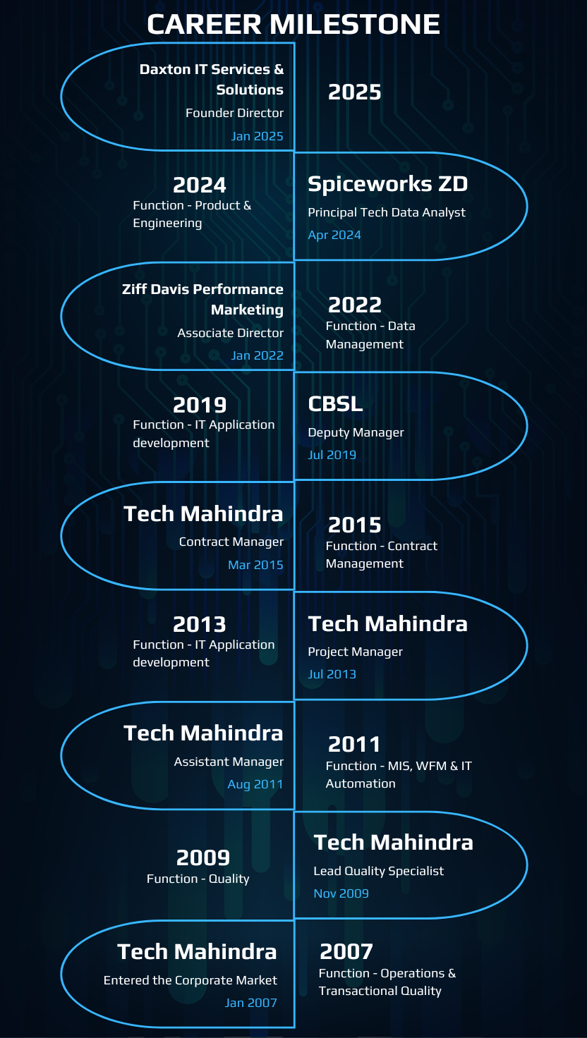 With over 25 years of diverse experience, I am the Founder and CEO of Daxton IT Services & Solutions PVT LTD. My journey has been one of growth and transformation, turning a vision into a reality by building a company focused on empowering businesses through innovative IT solutions. Having worked across industries like Banking & Finance, Telecom, and Entertainment, I’ve gained extensive knowledge and expertise that has shaped my approach as an entrepreneur.